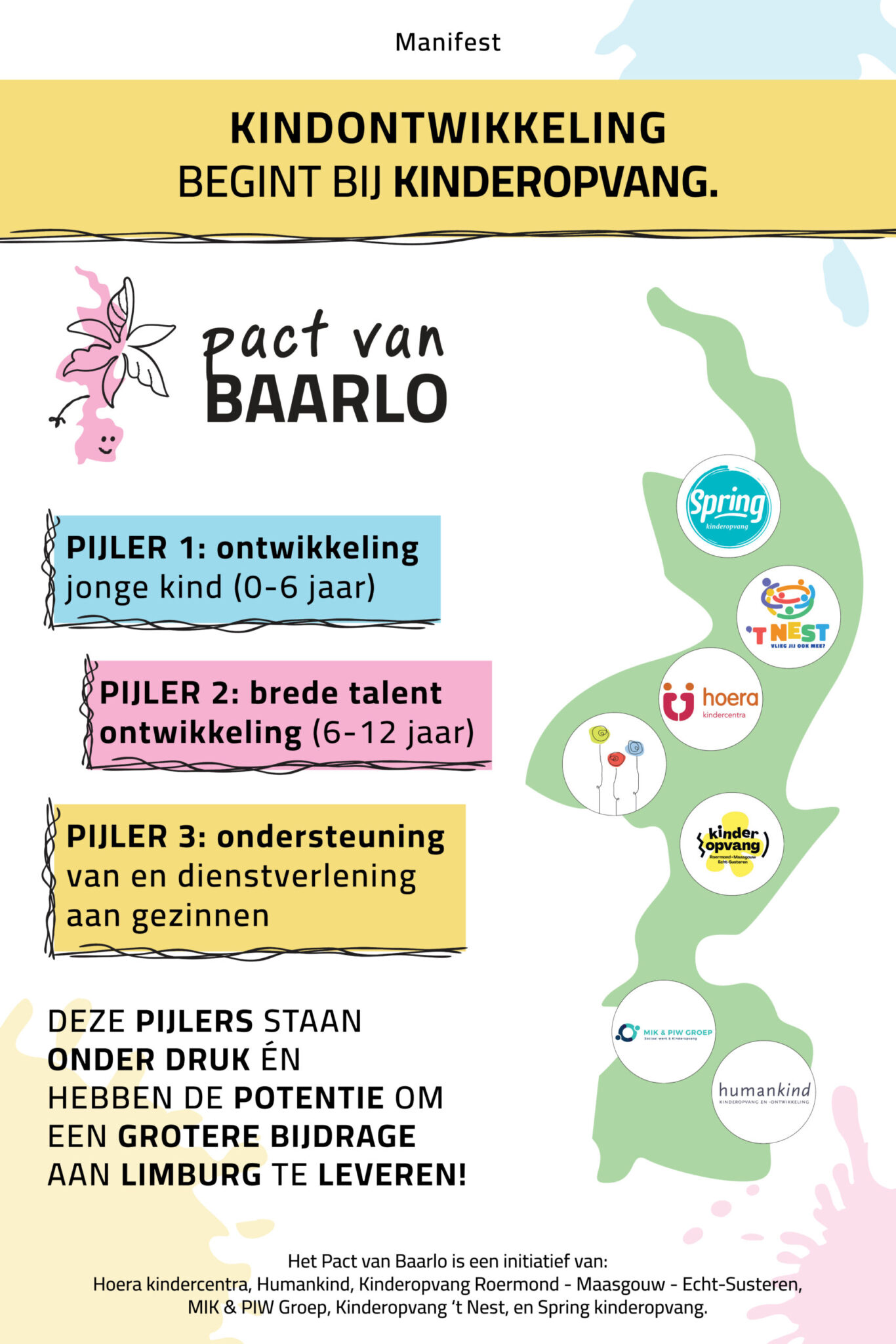 Daarom is er het Pact van Baarlo. Want investeren in de nieuwe generaties loont, via een samenwerking van Limburgse organisaties in de kinderopvang. Met één duidelijk verhaal: Kindontwikkeling begint bij kinderopvang.